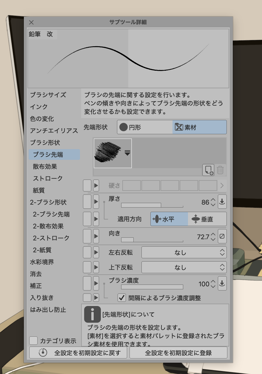 鉛筆だとガシガシ描けるかなと思って、自分で作りました。多分、大和がケーキ食べてる絵からこの鉛筆で線画描いてると思います。ブラシ先端の素材は、コピー用紙に鉛筆でシャシャシャっと描いたのを写真撮って取り込んだものです。