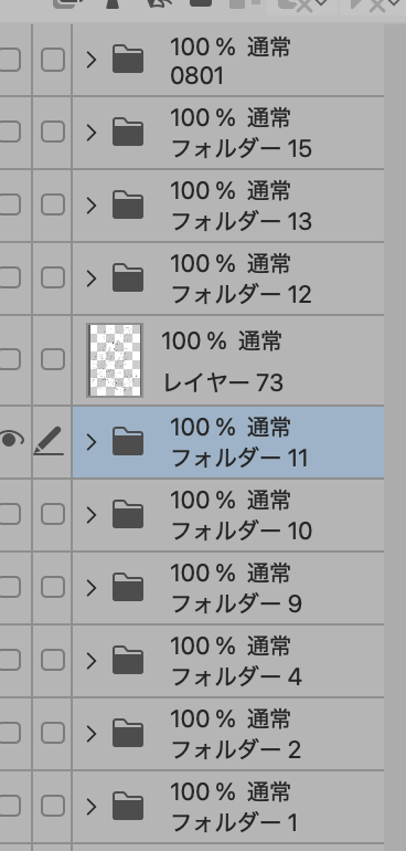 一枚絵でもフォルダーを作りまくってます。下書き複数あるなと思ったらフォルダ。これとこれをまとめて非表示にしたいからフォルダ…みたいな。