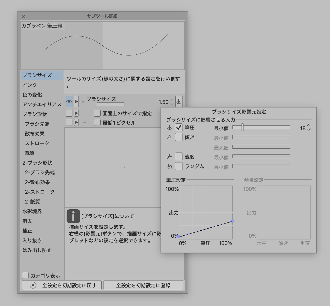 初期カブラペンを筆圧あまりかからないようにイジっただけのペンです。塗りは油彩平筆と油彩です。たまに不透明水彩です。設定に関してはあんまり詳しくないし、そこまで拘りがないので初期のままにしてます。